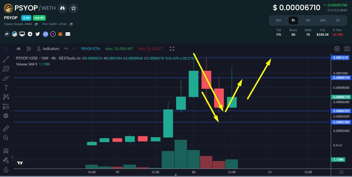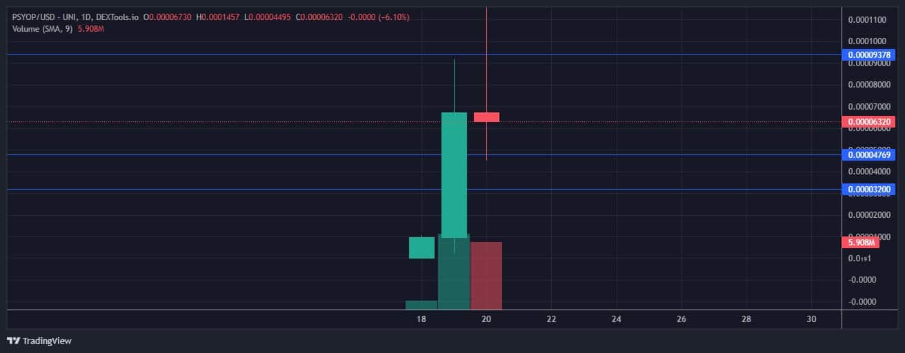 Il clima di forti preoccupazioni non ha fatto bene al token e il prezzo è bruscamente sceso secondo quanto rilevato da Dextools. PSYOP ha perso quasi il 70% dopo la testimonianza dello sviluppatore e nelle 24 ore ha perso ancora il 34%, oggi è scambiato a 0,00004204$.