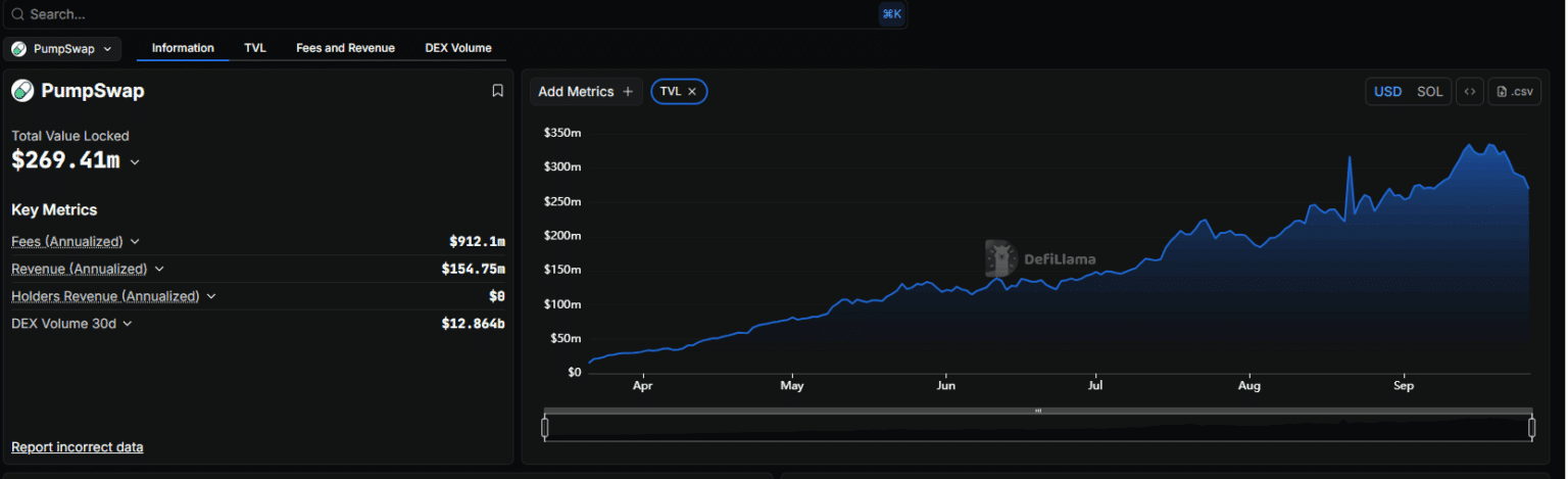 Anche PumpSwap, la piattaforma DeFi concorrente a Raydium, mostra dati interessanti: il Total Value Locked ha superato i 269 milioni di dollari secondo DefiLlama, evidenziando una crescente fiducia nel protocollo e nell’ecosistema associato a PUMP.