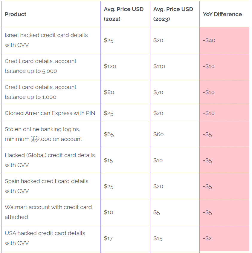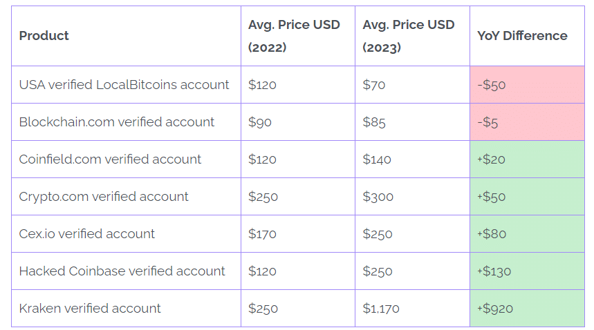 I conti degli exchange crypto, a differenza dei costi di carte di credito e documenti, sono l’unica categoria in aumento. Questo è probabilmente dovuto al fatto che i prezzi delle criptovalute sono stati in gran parte stagnanti nel periodo H2 2022 e H1 2023, il che ha comportato un minore interesse. Di conseguenza, i conti di trading e i wallet di criptovalute disponibili per gli hacker sono stati meno numerosi.