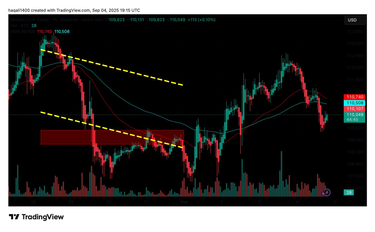 Il pattern ha costretto Bitcoin a scendere nella zona di supporto compresa tra 109.500 e 110.000 dollari. A questo livello gli acquirenti sono intervenuti per assorbire la pressione di vendita.