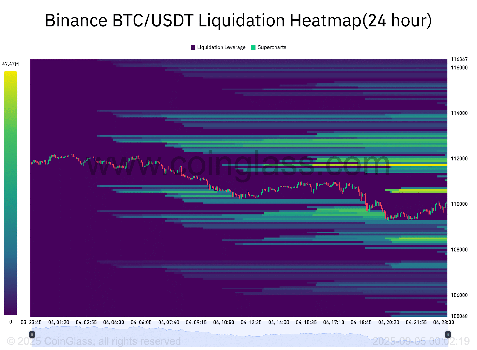 La struttura complessiva della liquidazione indica che i trader sono distribuiti su entrambi i lati. Gli short sarebbero a rischio al di sotto dei 108.000 dollari, mentre i long sarebbero a rischio al di sopra dei 112.000 dollari.