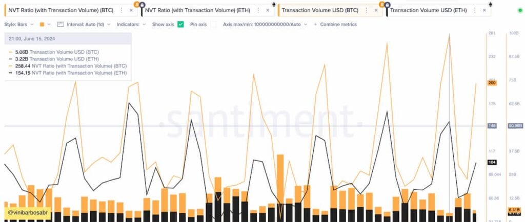 Attualmente, Bitcoin ed Ethereum presentano un rapporto NVT di 258 e 154 rispettivamente, indicando una capitalizzazione massicciamente superiore rispetto al volume totale di scambi sulle loro reti.