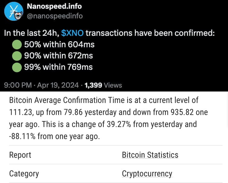 Oltre all’assenza di commissioni, la tecnologia block lattice consente la conferma dei blocchi con finalità deterministica in meno di un secondo, come riportato da Nanospeed.info. Al contrario, secondo i dati di yCharts, il tempo medio di conferma di Bitcoin è di 111 minuti.