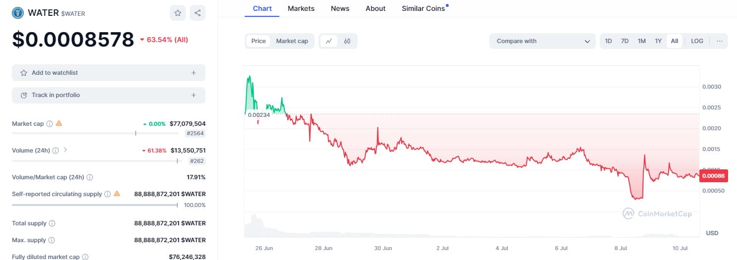 Al momento della stesura di questo articolo, WATER si trova a 0,0008578 dollari dopo un calo del 10,05% nelle ultime 24 ore. Ciò indica un calo del 26,89% negli ultimi 7 giorni e del 63,54% dalla sua quotazione.