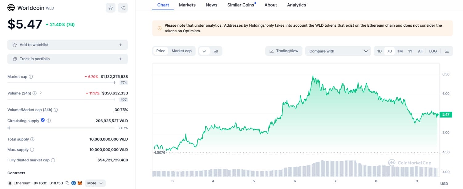 Al momento della stesura del seguente articolo, il token WLD era scambiato al prezzo di 5,47 dollari, segnando un calo del 7,58% nelle ultime 24 ore ma un aumento del 21,40% solo nell’ultima settimana, mentre ha registrato un mese non proprio brillante, durante il quale è sceso del 21,77%.