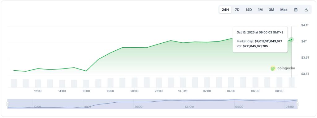 Ad oggi, il valore complessivo degli asset digitali si attesta intorno ai 4,019 trilioni di dollari, in crescita rispetto ai 3,83 trilioni del giorno precedente, secondo i dati di Coingecko.
