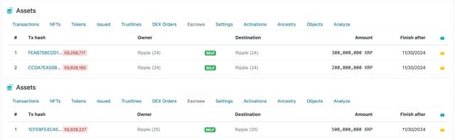 Tre escrow hanno raggiunto la scadenza negli ultimi minuti del 30 novembre. I token si trovano su due noti indirizzi di proprietà di Ripple. In particolare, l’indirizzo ‘Ripple (24)’ sbloccherà 200 e 300 milioni di XRP che erano stati bloccati a novembre e dicembre 2020.