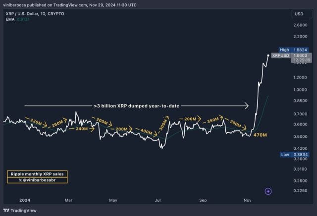 In sintesi, XRP è aumentato del 162% dall’inizio dell’anno (YTD) in un anno in cui le vendite hanno superato i $5 miliardi al prezzo attuale. Oggi, il token viene scambiato a $1,66 mentre Ripple si prepara all’ultimo mese di vendite del 2024.