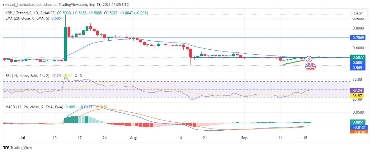 A livello tecnico, gli indicatori chiave forniscono ulteriori dettagli sulle prestazioni di XRP. L’EMA a 20 giorni (media mobile esponenziale) è attualmente a 0,5051$, molto vicino all’attuale prezzo XRP a 0,5073$, confermando il trend rialzista a breve termine.