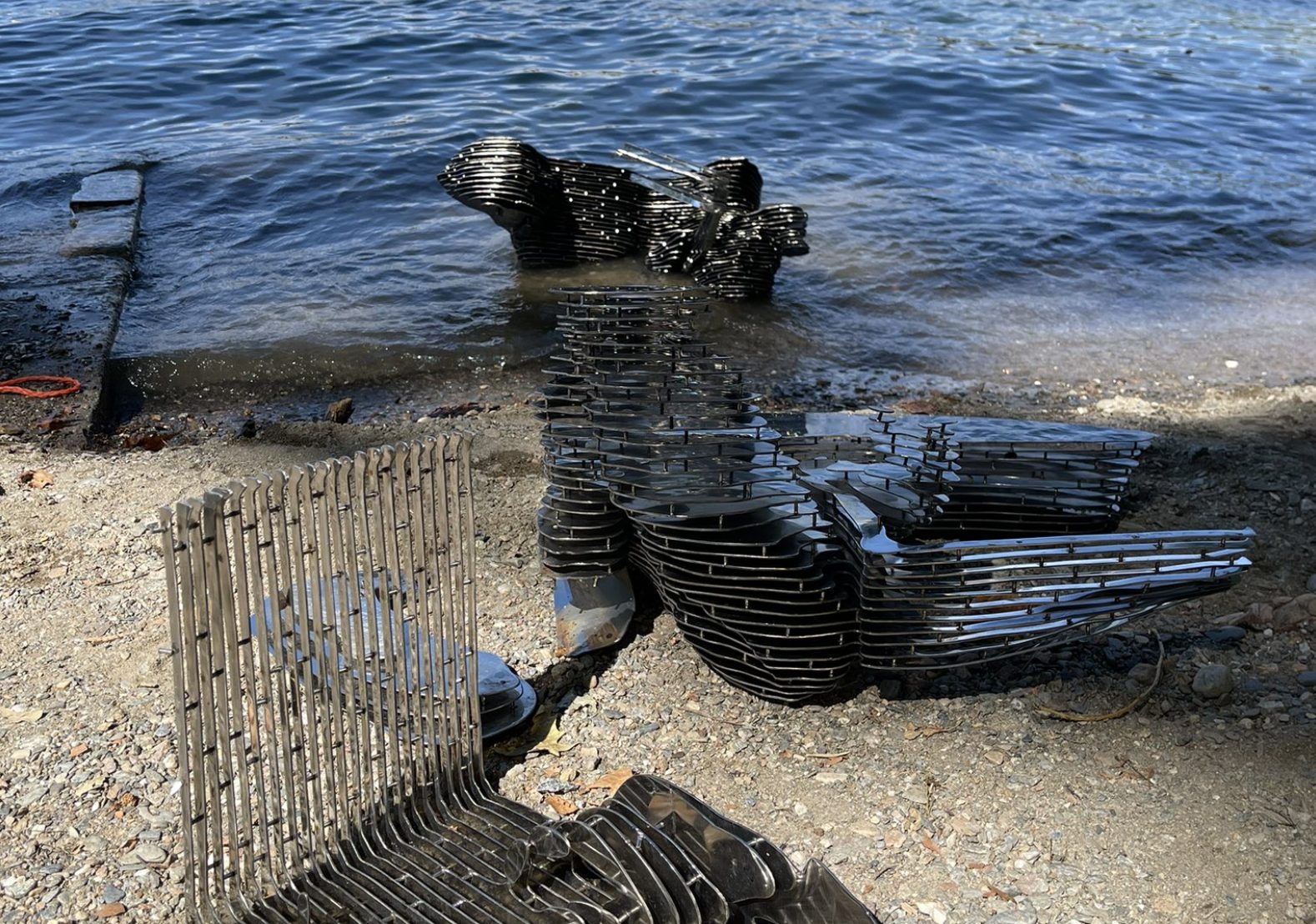 Ai punti di fissaggio della base sono rimasti soltanto i piedi mentre il resto della scultura “Disappearing Satoshi”, inizialmente scomparsa, è stato successivamente recuperato dalle acque del lago.
