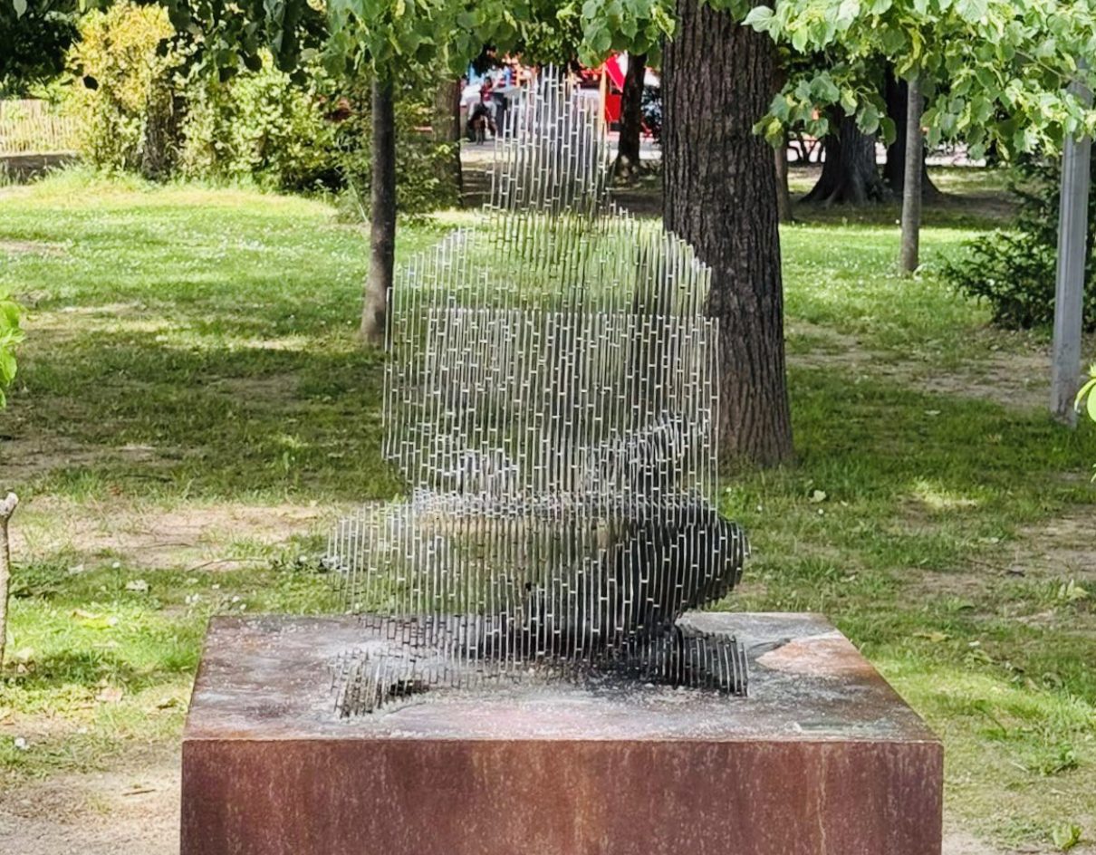 L’artista Valentina Picozzi ha creato una scultura in acciaio inossidabile e blocchi di corten che raffigura una figura seduta davanti a un laptop, la figura sembra svanire se vista da diverse angolazioni.