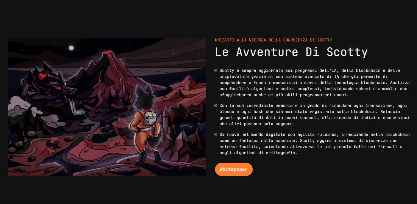 L’intelligenza artificiale Scotty è stata descritta come il “Guardiano dell’Universo Crypto“. Sul sito ufficiale della prevendita, in effetti, c’è un’intera storia che spiega l’origine e la presenza di Scotty the AI – un cane che protegge l’universo crittografico. Scotty l’IA è un terrier scozzese con un “sorprendente manto dal colore nero come quello del cielo notturno”.