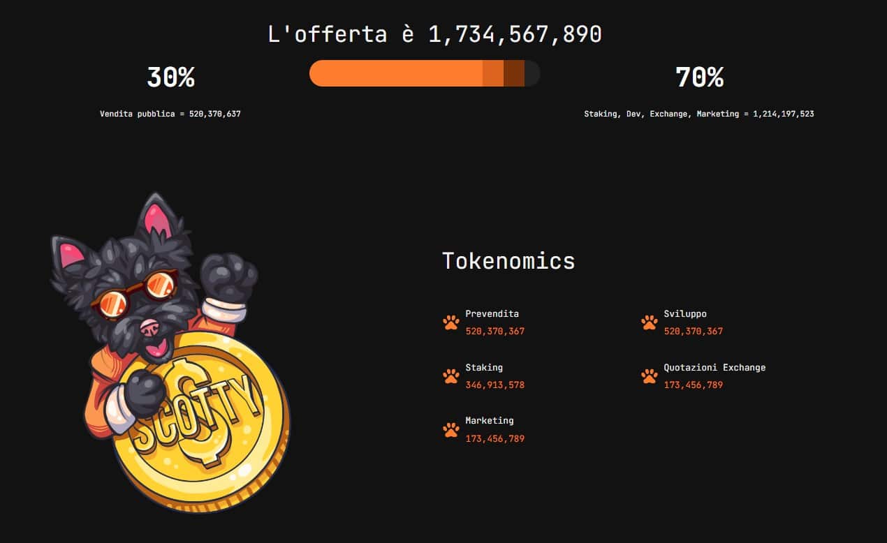 Il 30% dell’offerta totale dei circa 1,734 miliardi di token, circa 520 milioni, è stato destinato alla prevendita pubblica. Il restante 70%, circa 1,2 miliardi di token SCOTTY, sarà destinato allo staking, allo sviluppo, alla liquidità di scambio e al marketing.