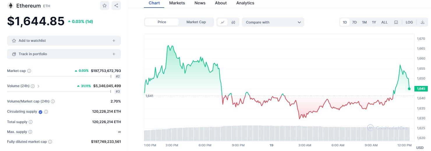 Secondo i dati di CoinMarketCap, al momento della stesura dell’articolo ETH è scambiato a circa 1.644,85 dollari, con un aumento dello 0,03% rispetto al giorno precedente. Il volume degli scambi ha registrato un significativo aumento del 31,11% nella giornata, salendo a 5,34 miliardi di dollari.