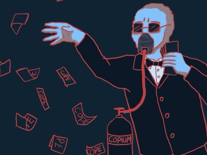 Per quanto riguarda il nome: $COPIUM, sembra essere un “portmanteau” delle parole “cope” e “opium”. Un riferimento scherzoso a un gas inalato dai degenerati delle criptovalute per far fronte alle loro perdite.