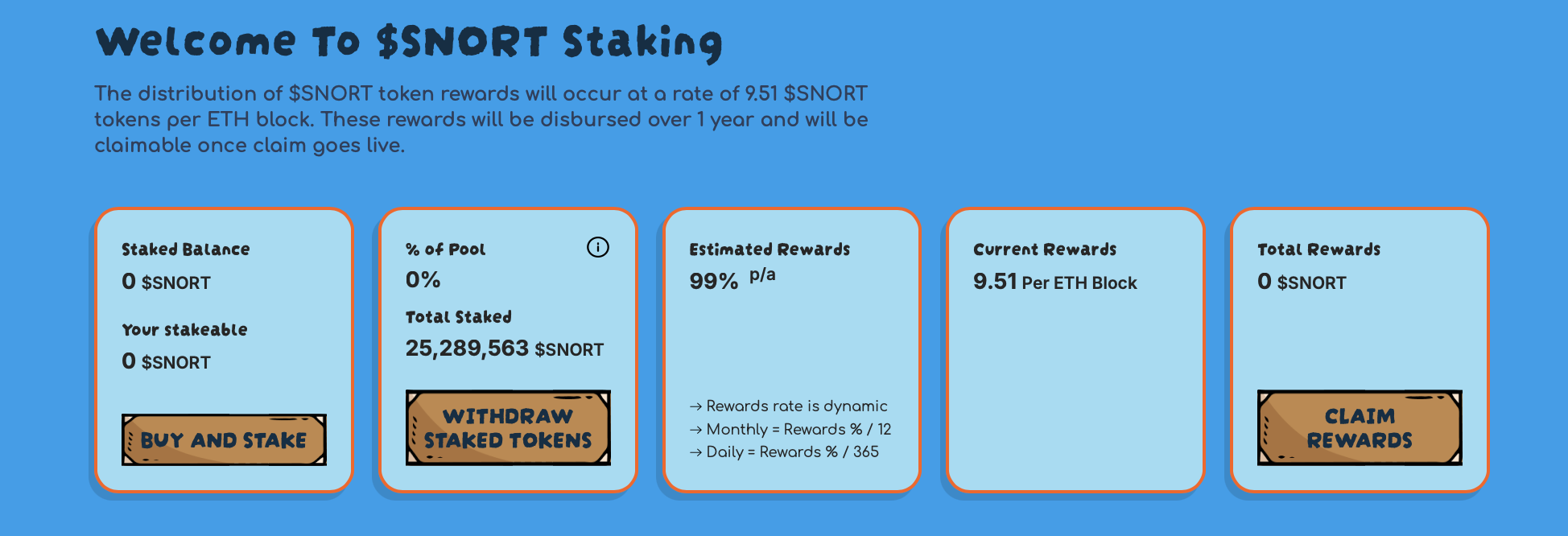 Ricorda: i token SNORT possono essere messi in staking, che al momento genera un APY dinamico del 99% tramite il protocollo nativo del progetto.