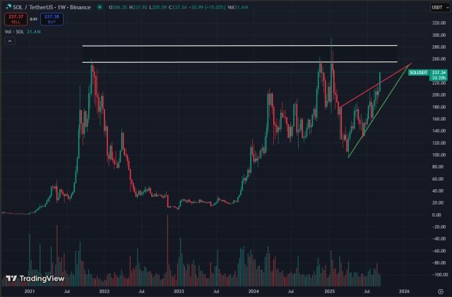 Il dato di partenza è che Solana ha appena rotto una resistenza chiave che gli analisti tenevano d’occhio da tempo nella fascia 210-220 dollari e lo ha fatto con decisione.