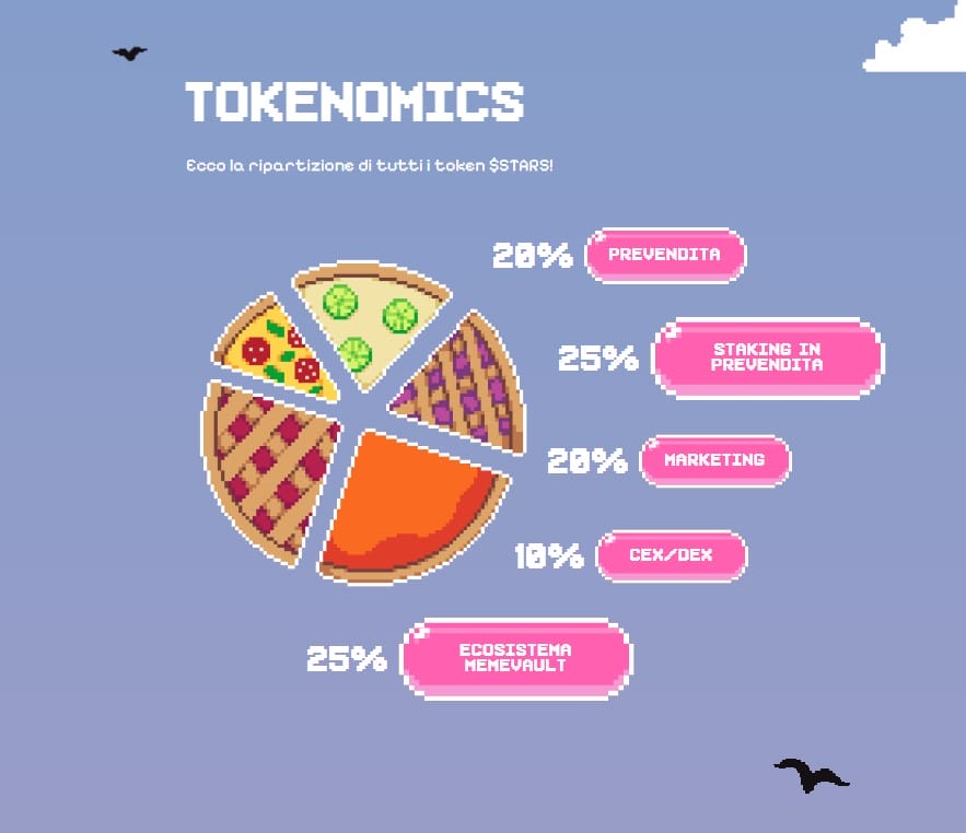 Il team ha stanziato il 20% dei token per la prevendita; il restante 25% è destinato alle ricompense dello staking, il 20% al marketing, il 10% al listing su CEX/DEX e il restante 25% all’ecosistema MemeVault.