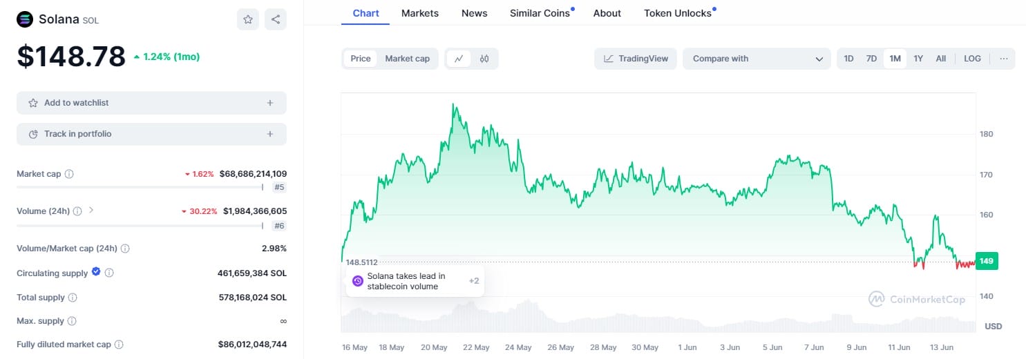 Secondo i dati di CoinMarketCap, al momento della stesura dell’articolo Solana era scambiato al prezzo di 148,78 dollari, segnando un calo dell’1,71% nelle ultime 24 ore, un calo del 13,50% nei sette giorni precedenti, pur mantenendo l’incremento dell’1,24% accumulato sul suo grafico mensile.