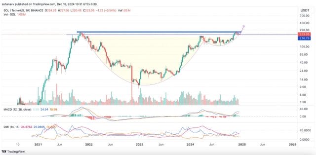 L’attuale situazione porta a ritenere che il prezzo possa mantenere il supporto a 216 dollari, con un potenziale rimbalzo verso un nuovo massimo storico (ATH) sopra i 400 dollari nel 2025. Se ciò non dovesse accadere, si teme un calo sotto i 200 dollari.