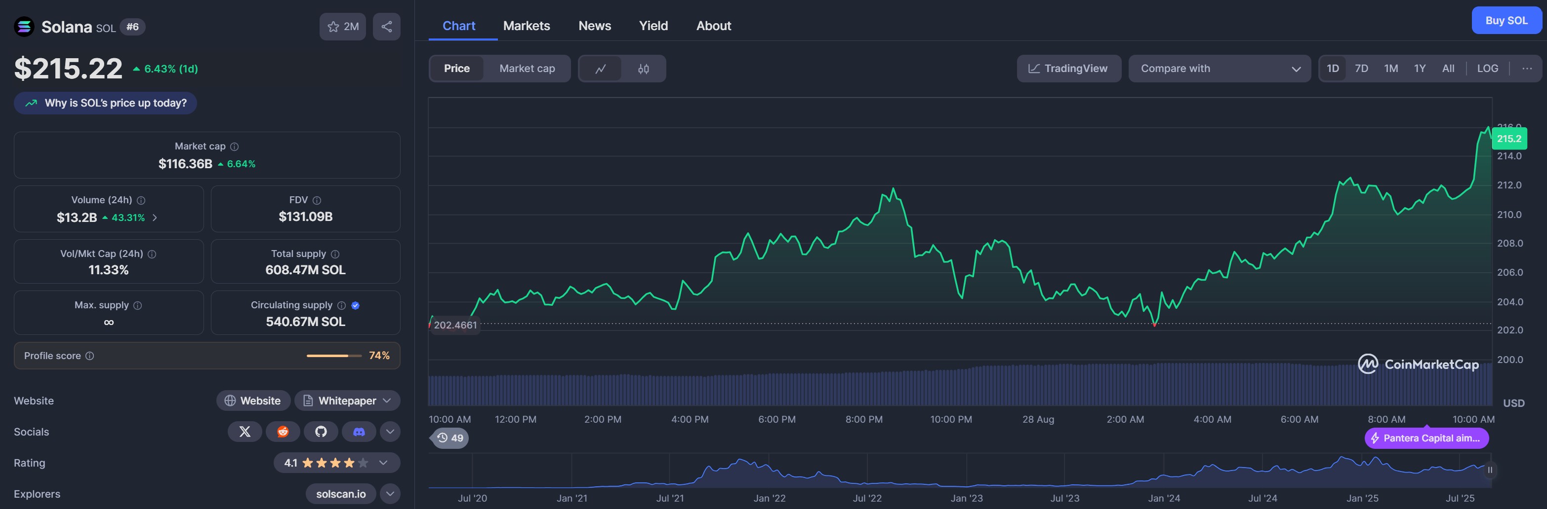 Secondo i dati di CoinMarketCap, al momento della pubblicazione il prezzo di SOL è in rialzo del 6,43% a 215,22 dollari, con volumi di scambi giornalieri che hanno raggiunto i 13,2 miliardi di dollari.