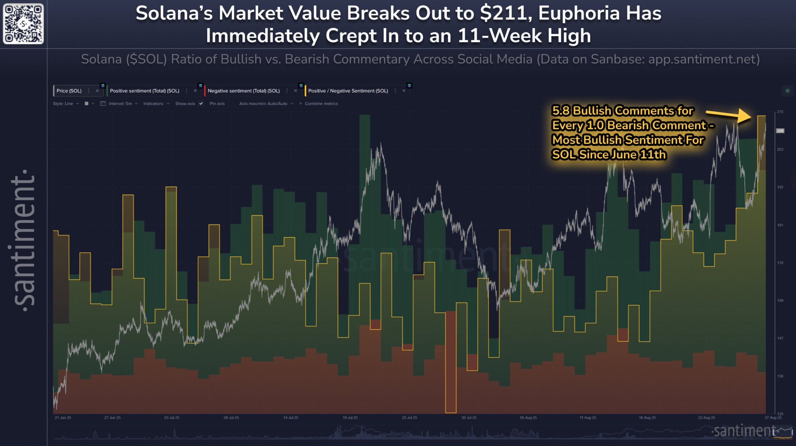 La società di analisi blockchain Santiment ha recentemente riportato che SOL ha ricevuto una spinta a 211 dollari, testando nuovamente il livello di resistenza di febbraio. Il sentiment al dettaglio appare molto ottimista, con 5,8 commenti rialzisti per ogni commento ribassista, il rapporto più forte delle ultime 11 settimane, superiore alla maggior parte delle altcoin.