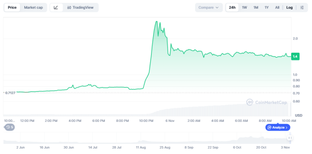 L’incredibile performance di SOON, con un rialzo che si aggira intorno al 100% nelle ultime 24 ore, ha portato il prezzo del token a $1,40, superando ampiamente la crescita media del mercato crypto (+1,6%). Tre sono i driver principali: