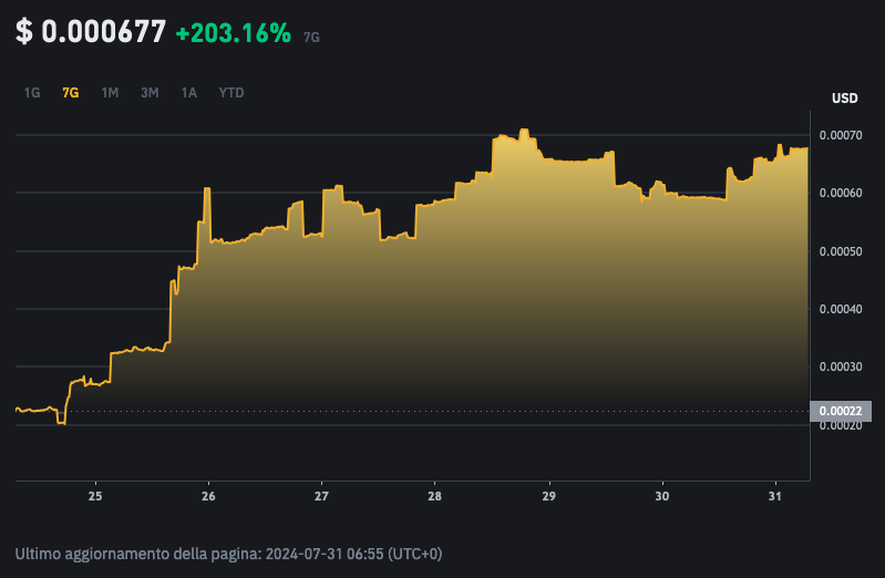Attualmente $SPONGE ha un valore di $0,000677, che rappresenta un incremento del 67,58% rispetto a un mese fa e addirittura del 203,16% nel confronto con la settimana scorsa.