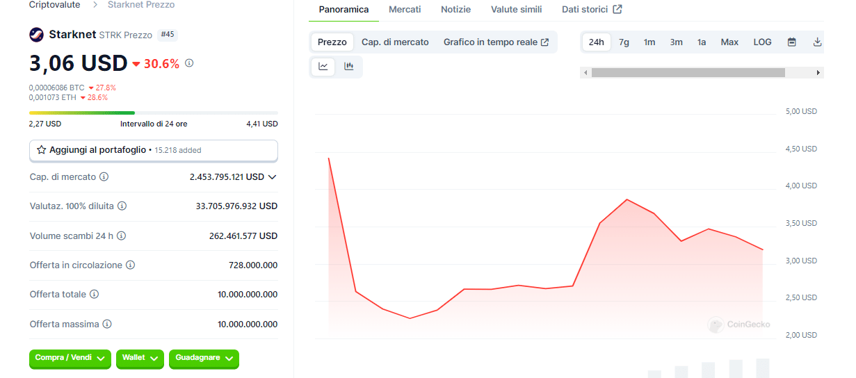 Sull’exchange KuCoin, STRK è salito fino a 5 dollari prima di scendere rapidamente a 2,10 dollari. I dati di CoinGecko mostrano che il valore del token è salito a 4,41 dollari salvo poi scendere ancora. Nel momento in cui scriviamo il token è valutato 3,06 dollari.