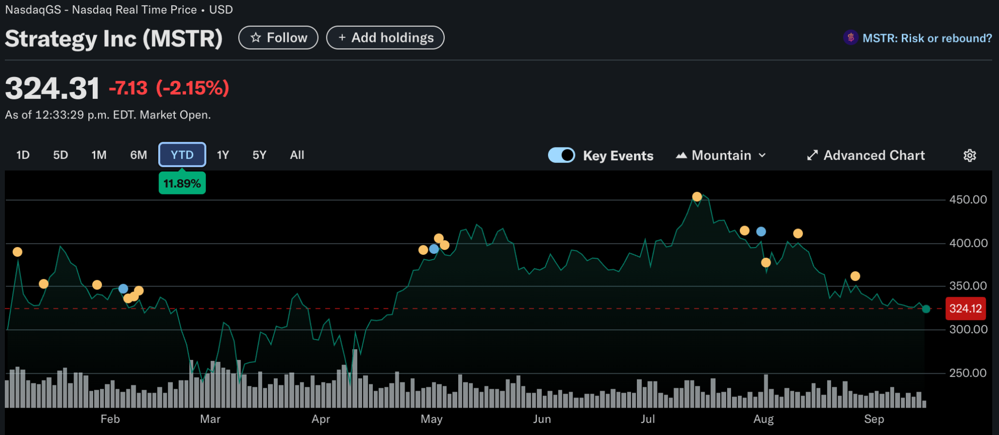 A seguito dell’acquisto odierno, il titolo Strategy (MSTR) è scambiato a 324,31 dollari al momento della stesura di questo articolo, in calo del 2,15% nelle ultime 24 ore ma in rialzo dell’11,89% su base annua (YTD).