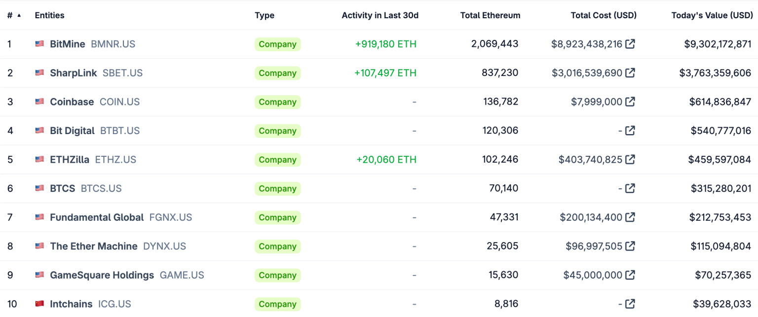 In termini di società quotate in borsa con la più alta quantità di ETH detenuta, BitMine è in cima alla lista. Altre entità che compongono la top five sono SharpLink, Coinbase, Bit Digital ed ETHZilla.