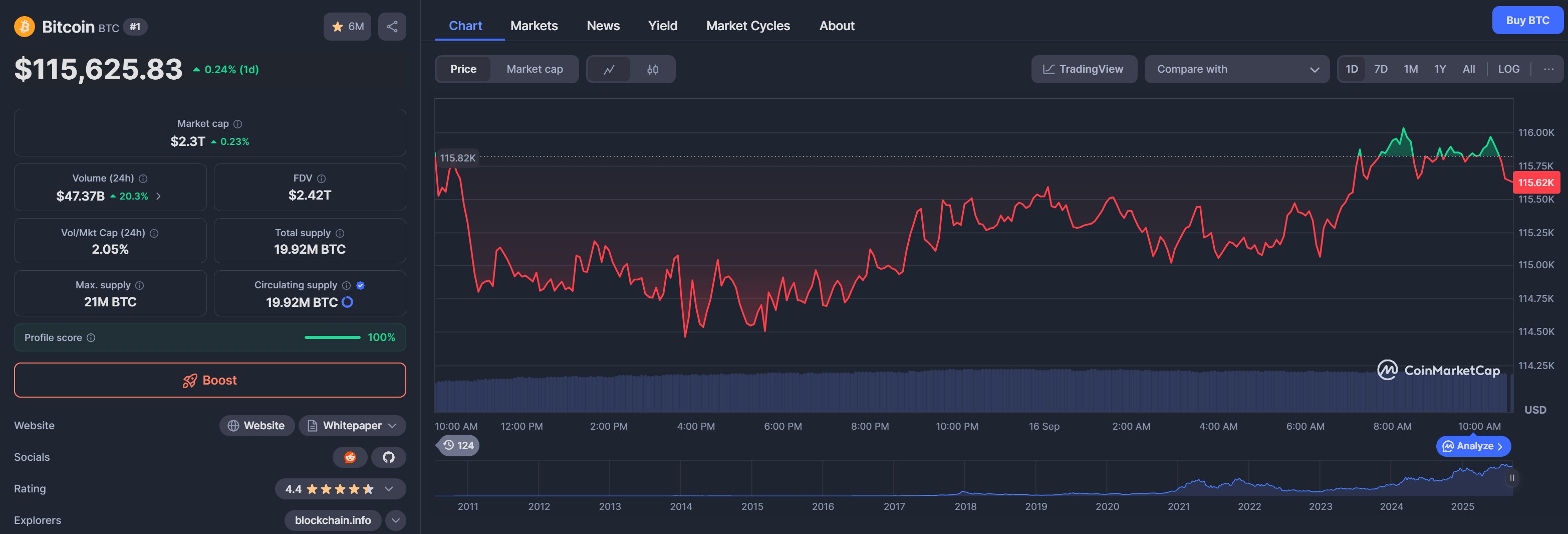 Al momento della stesura dell’articolo, Bitcoin era scambiato a 115.625 dollari, registrando una leggera flessione dello 0,24% nelle ultime 24 ore ma un aumento del 2,35% sul grafico settimanale.