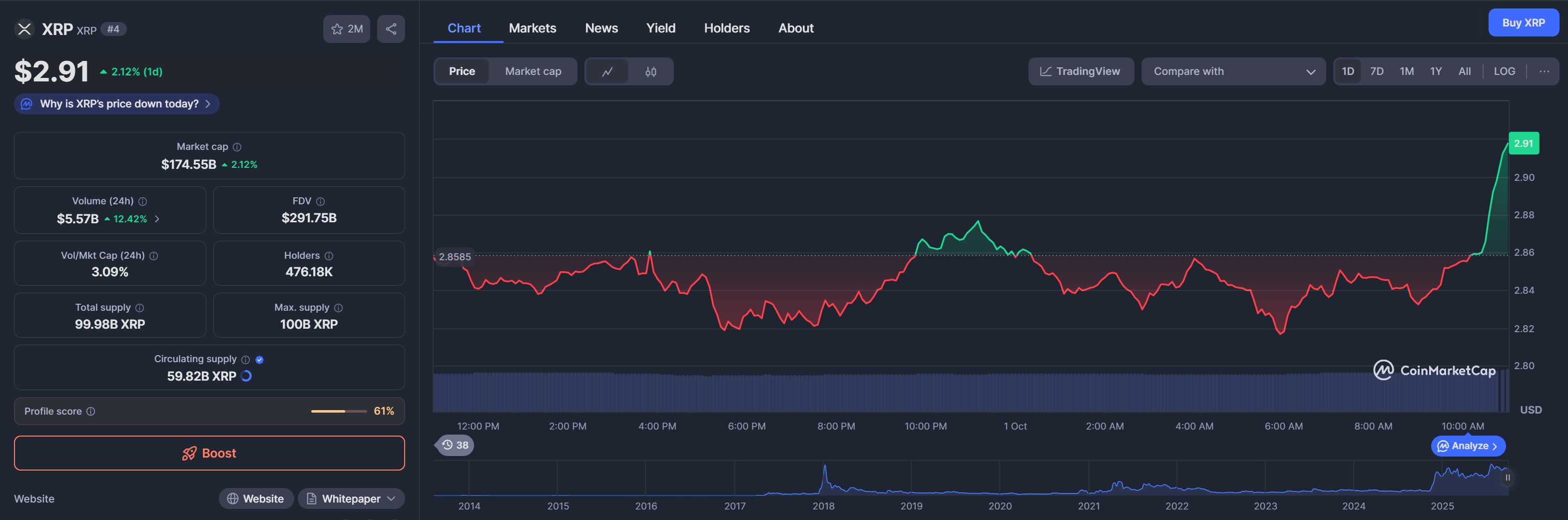 Al momento della stesura dell’articolo, XRP era scambiato a 2,91 dollari, in rialzo del 2,12% nelle ultime 24 ore. Il token di Ripple ha registrato un aumento dell’1,44% negli ultimi sette giorni e del 2,94% negli ultimi 30 giorni. Anche il volume giornaliero di scambi ha segnato un notevole incremento del 12,42%, a 5,57 miliardi di dollari, segnalando il rinnovato interesse per XRP, mentre la capitalizzazione di mercato del token è aumentata del 2,12% a 174,55 miliardi di dollari.