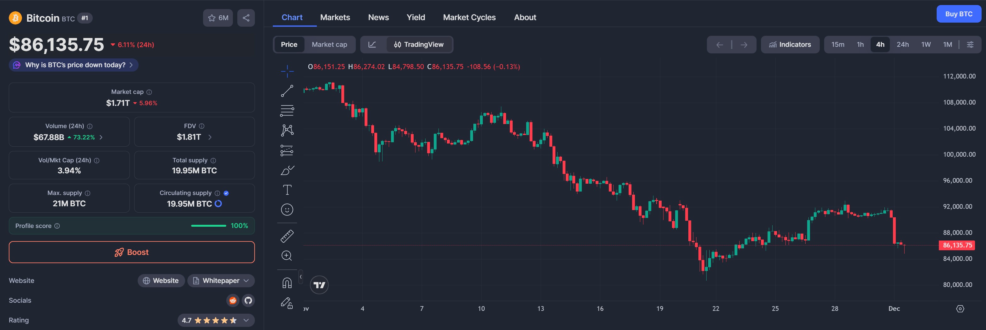 Secondo i dati di CoinMarketCap, al momento della stesura dell’articolo Bitcoin era scambiato a 86.135 dollari, con una flessione del 6,11% nelle ultime 24 ore.
