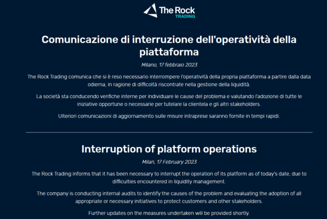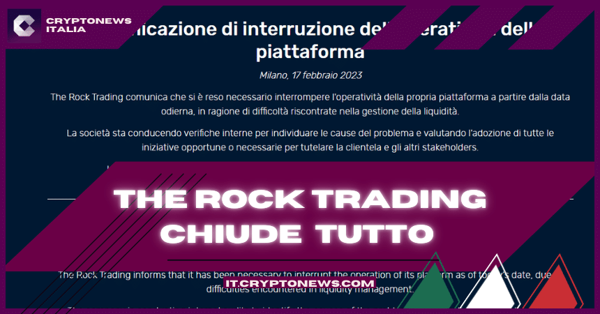 Alla fine The Rock Trading ha chiuso definitivamente i battenti. Venerdì avevamo dato la notizia che l’exchange italiano era in difficoltà, ma nel giro di poche ore le difficoltà si sono trasformate nell’impossibilità di gestire la liquidità e da sabato la piattaforma non è più accessibile. I peggiori timori, nonostante le dichiarazioni del board di non preoccuparsi e di non generare false preoccupazioni, alla fine si sono avverati.