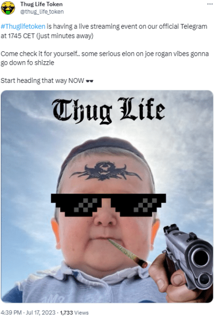 Il progetto meme coin sta anche organizzando un evento di lancio in live streaming di Telegram, che i trader possono trovare su t.me/thuglifetoken.