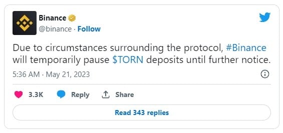 Binance sospende temporaneamente i depositi TORN tra le preoccupazioni del protocollo Tornado Cash