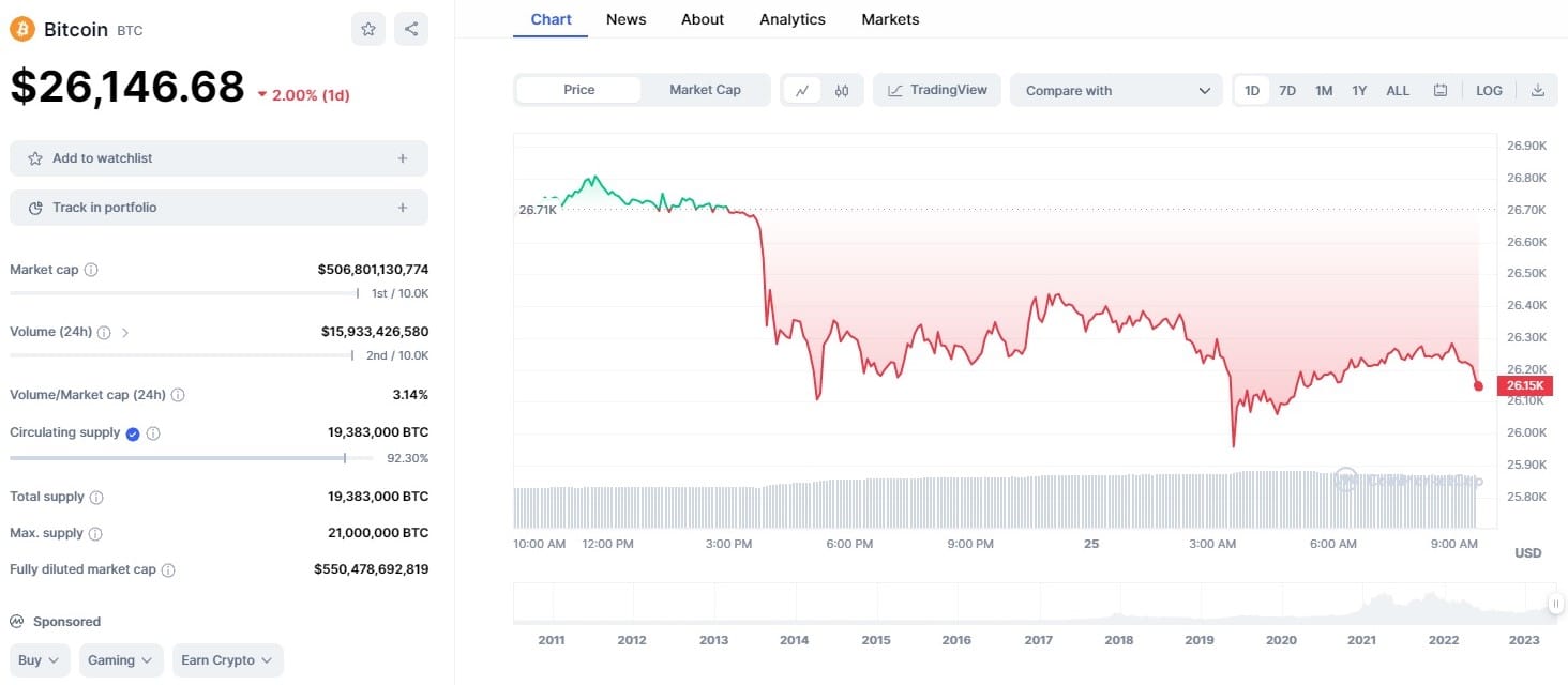 Nelle ultime 24 ore, BTC è sceso del 2%. Nel momento in cui scriviamo, Bitcoin è scambiato a 26.156,68 dollari con una capitalizzazione di mercato di 507 miliardi di dollari.