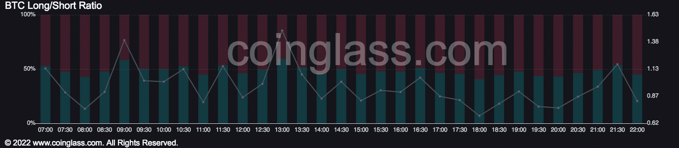 Inoltre, il rapporto BTC Long/Short su Coinglass mostra che le posizioni ribassiste sulla crypto hanno superato quelle rialziste. Attualmente, il rapporto nel grafico a 30 minuti è di 0,83:1, con le posizioni corte che rappresentano il 54,72% del mercato. Nel frattempo, le posizioni lunghe rappresentano solo il 45,28% degli operatori del mercato.