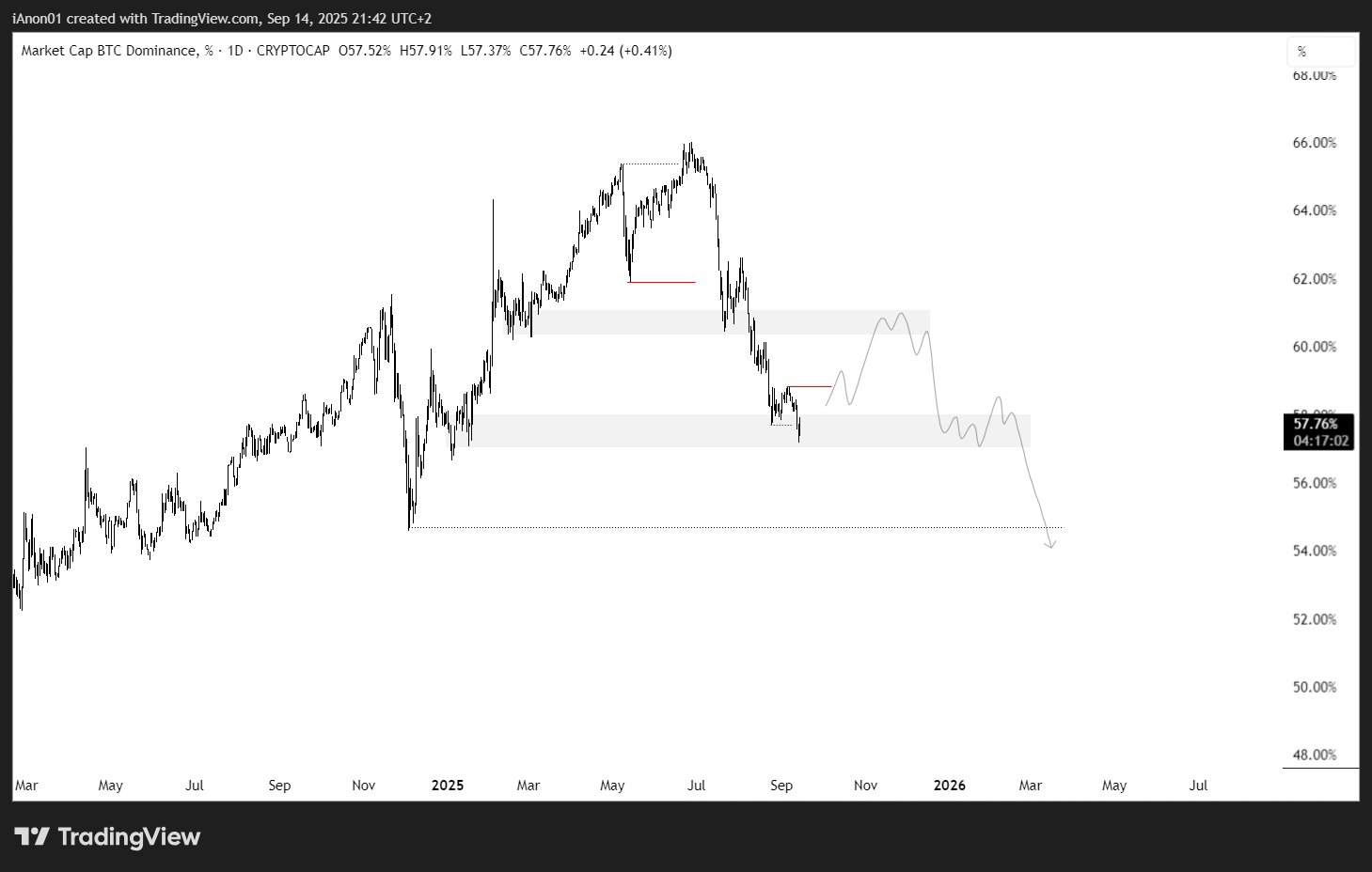 I grafici tecnici indicano un possibile rimbalzo della dominance di Bitcoin, in calo nelle ultime settimane. Un eventuale aumento fino al 57,5%, con possibile estensione verso il 60%, darebbe a Bitcoin un ultimo slancio rispetto alle altcoin prima della rotazione.