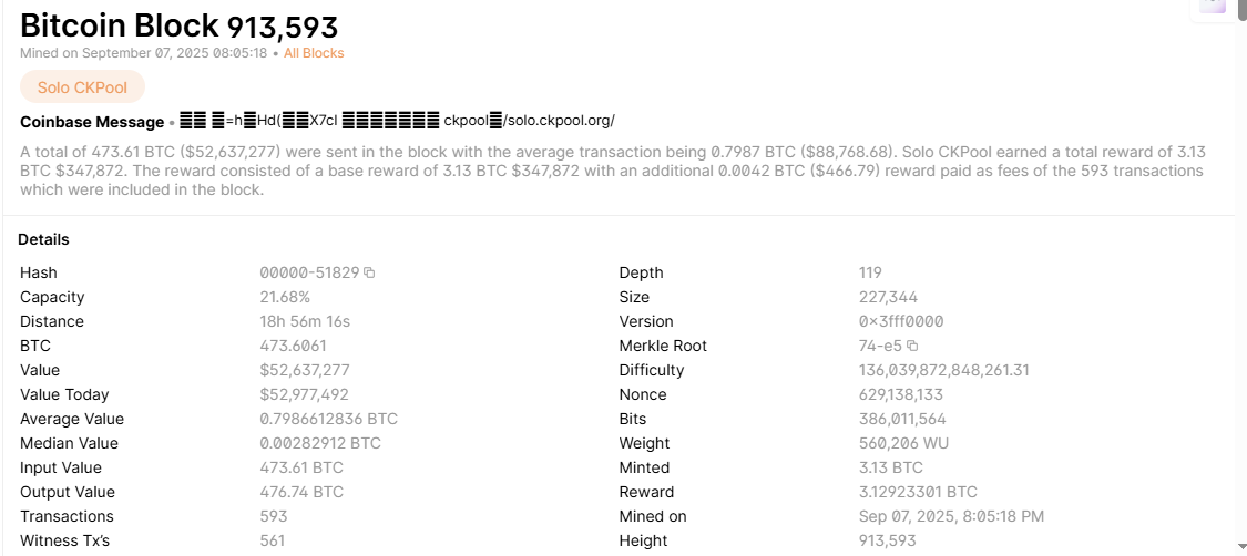 Il 7 settembre, un minatore di Bitcoin solitario ha vinto contro ogni previsione, riuscendo a minare il blocco 913.593 tramite Solo CKPool. Poiché il mining di Bitcoin è redditizio, ha guadagnato 3,13 BTC, per un valore di quasi 350.000 dollari al prezzo attuale di Bitcoin di 112.198 dollari.