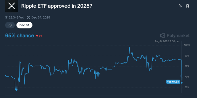 Le probabilità di approvazione di un ETF su XRP hanno subito fluttuazioni a causa del calo di fiducia nel mercato. I dati di Polymarket mostrano un calo fino al 65%, in discesa rispetto ai precedenti picchi superiori al 90%.