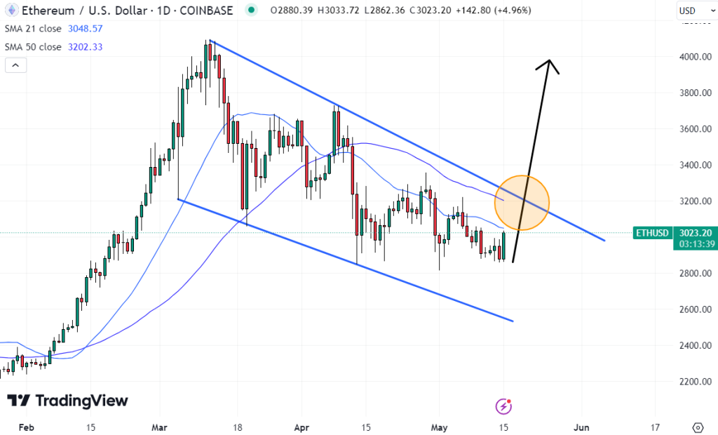 L’analisi tecnica suggerisce che il mercato non è ancora in mano ai tori. Il prezzo di Ethereum rimane al di sotto della 21DMA a 3.050 dollari, così come della 50DMA e della 100DMA. Anche il prezzo rimane bloccato entro i confini di un canale di tendenza al ribasso. Sarà necessaria una spinta convincente sopra i 3.200 USD per fornire un segnale di prezzo rialzista a medio termine.