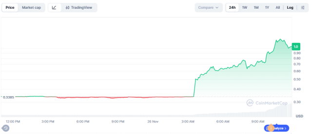 Il volume di trading nelle 24 ore è esploso del 471% fino a 75 milioni di dollari, confermando lo slancio rialzista.