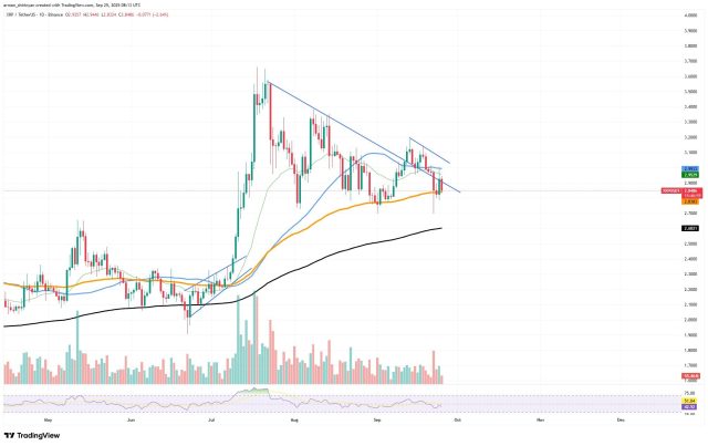 XRP non è riuscito a generare abbastanza slancio: il grafico mostra che il prezzo fatica a mantenersi sopra i 3 dollari, restando bloccato sotto linee di resistenza discendenti.