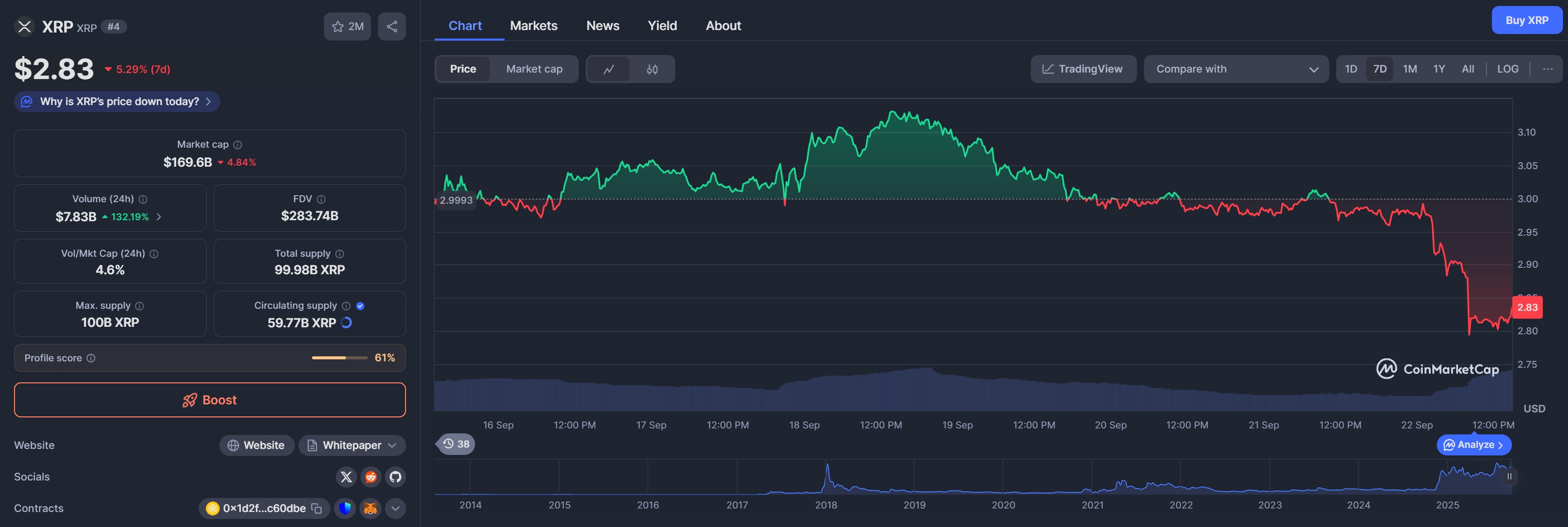Al momento della stesura dell’articolo, il token era scambiato a 2,83 dollari, in calo del 4,49% nelle ultime 24 ore. Nell’ultima settimana, XRP ha perso il 5,29%, mentre la sua capitalizzazione di mercato è scesa a 169,6 miliardi di dollari dopo aver perso 11,2 miliardi di dollari in un solo giorno.