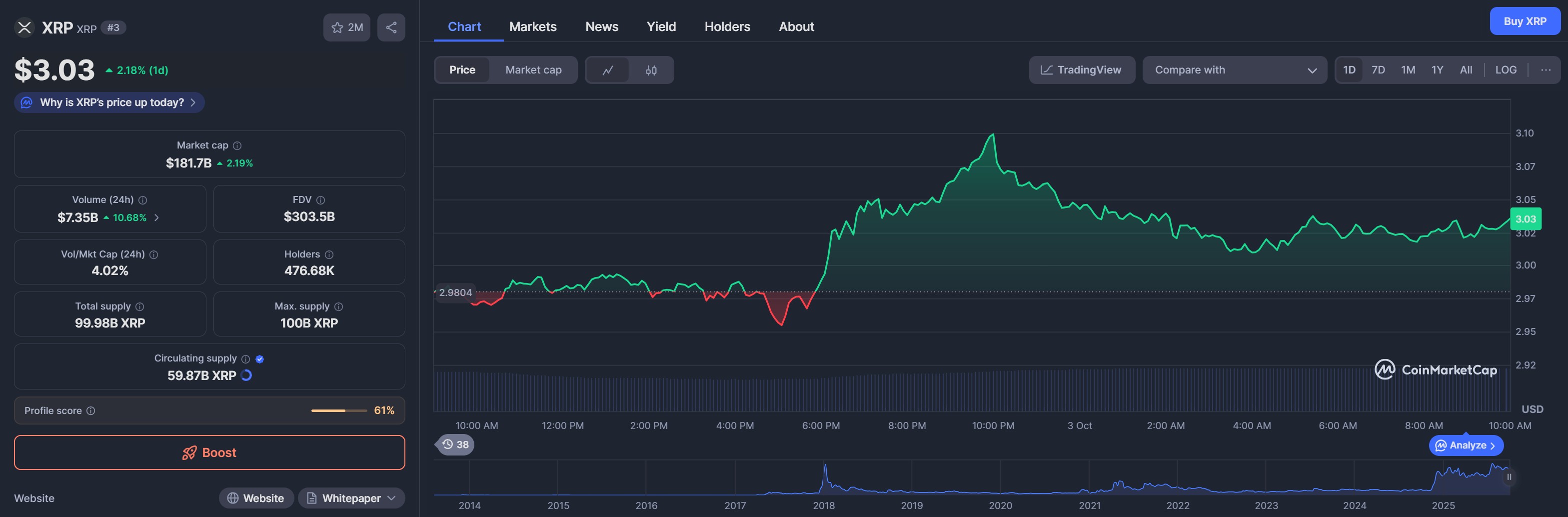 Uptober è arrivato e il mercato delle criptovalute ha subito virato verso il verde, continuando a mantenere la rotta. Ieri XRP ha guadagnato il 4,66%, con un aumento del 4,17% rispetto alla settimana precedente, oggi il token di Ripple è aumentato di un altro 2,18% e al momento della stesura dell’articolo era scambiato a 3,03 dollari.