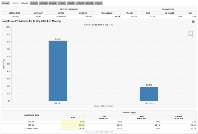 Secondo CME FedWatch – uno strumento sviluppato dal Chicago Mercantile Exchange (CME) per stimare le probabilità di variazione dei tassi d’interesse da parte della Federal Reserve (statunitense nelle prossime riunioni del FOMC – c’è una probabilità dell’81,2% che la FED riduca i tassi di interesse di 25 punti base a settembre. Un taglio dei tassi potrebbe portare a un aumento degli investimenti rischiosi. Uno scenario del genere potrebbe far impennare il prezzo di XRP.