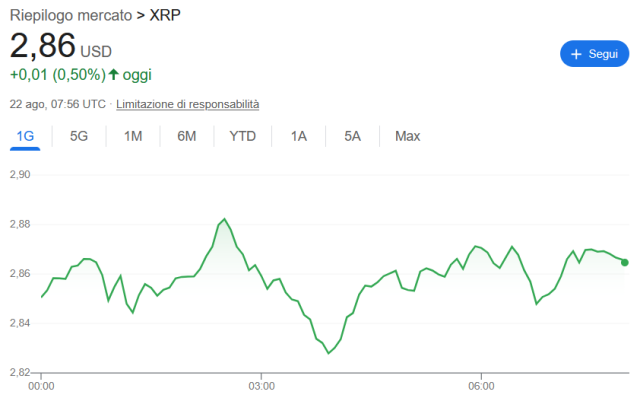 Al momento XRP è scambiato a $2.86, sostanzialmente stabile nel corso delle ultime 24 ore ma in calo del 19,3% nell’ultimo mese. Nonostante la correzione, l’asset ha comunque guadagnato il 37,72% da inizio anno.