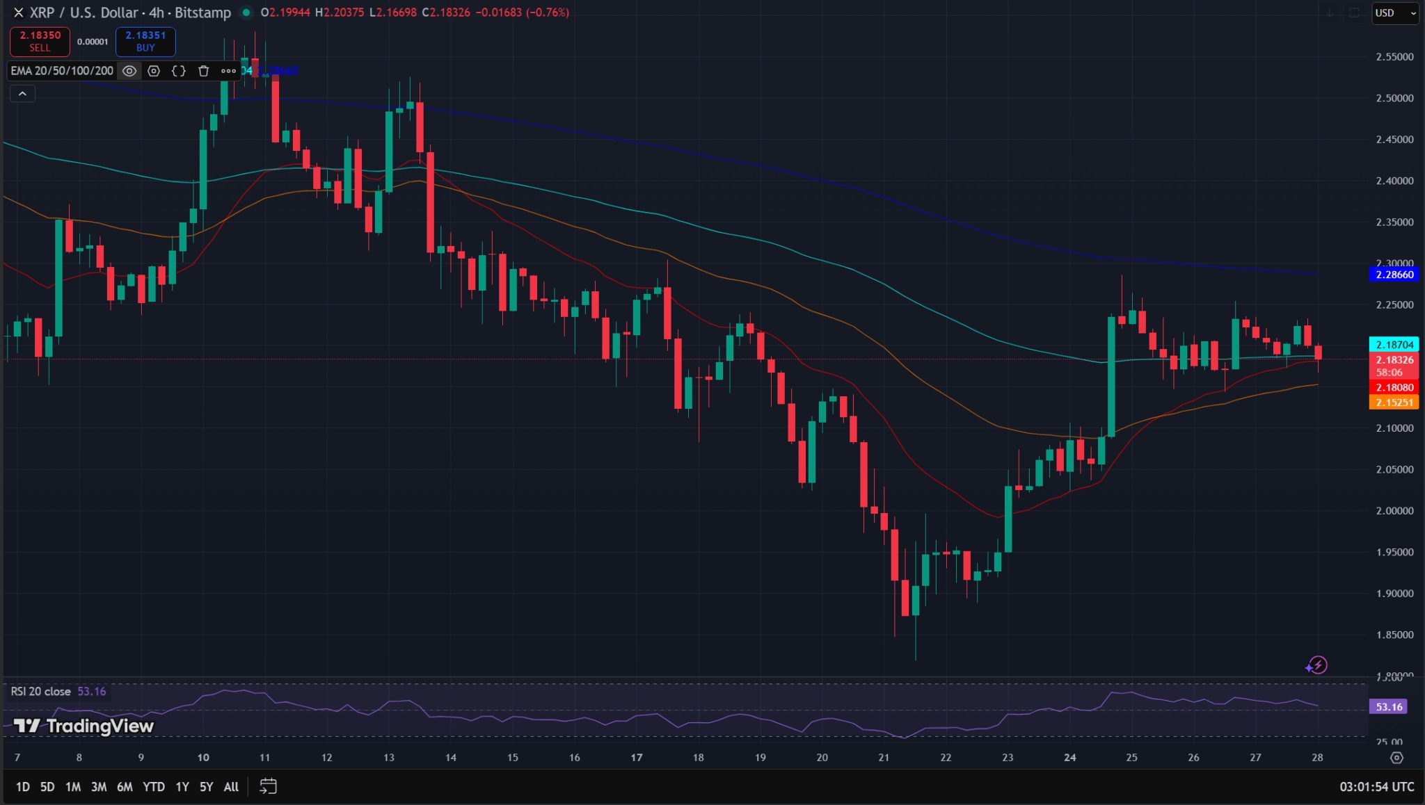 XRP ha riconquistato le sue EMA a 20 e 50 giorni e sta testando la EMA a 100 giorni. Un superamento deciso dei 2,18 dollari potrebbe spingerlo vers la EMA a 200 giorni a 2,28 dollari. Mantenere quel livello permetterebbe di puntare ai 2,5 dollari.